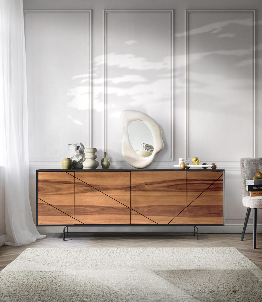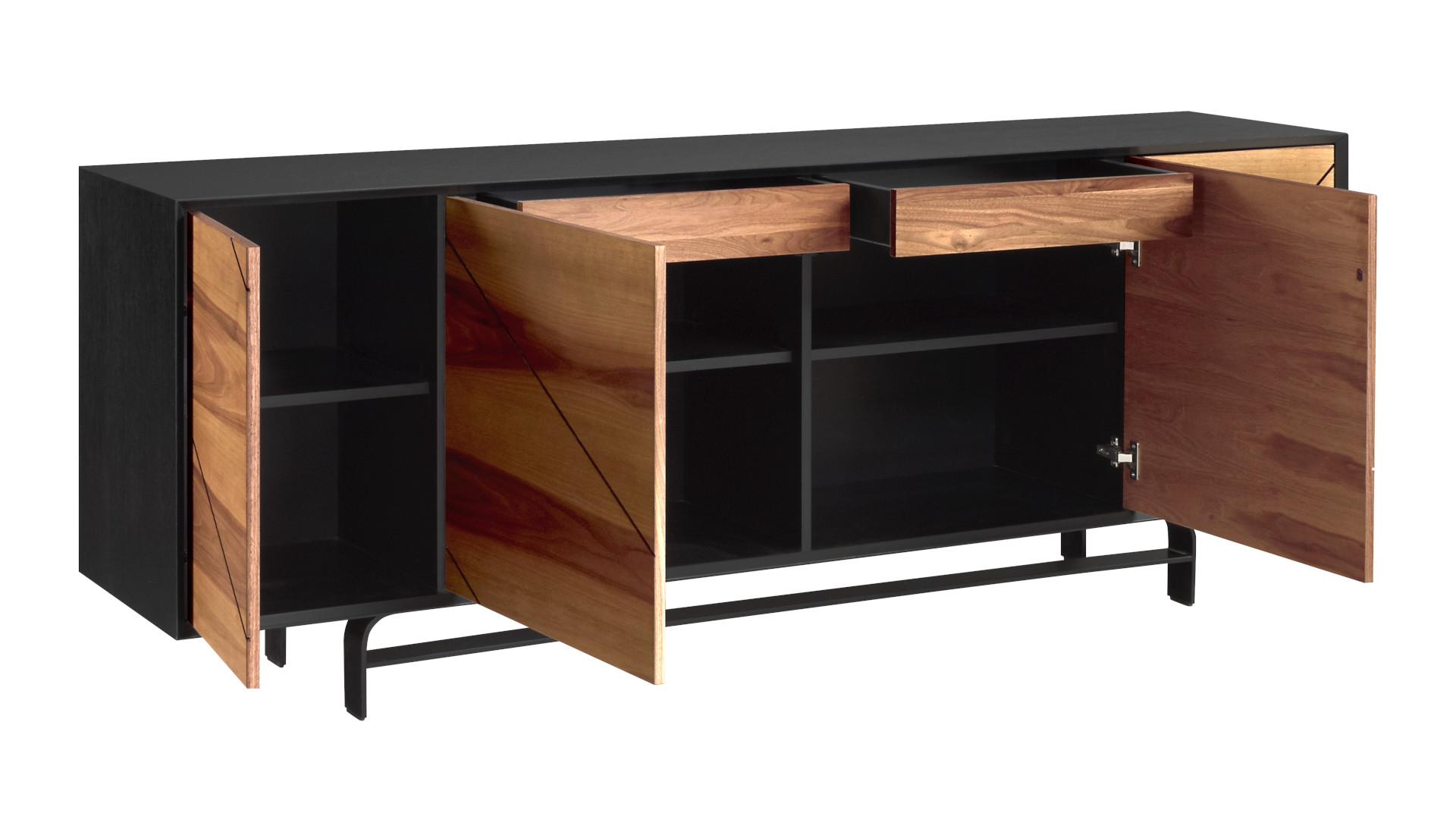 Komoda Verano obsahuje štyri dvierka, vo vnútri sú poličky a v strednej časti sú dve skryté zásuvky.